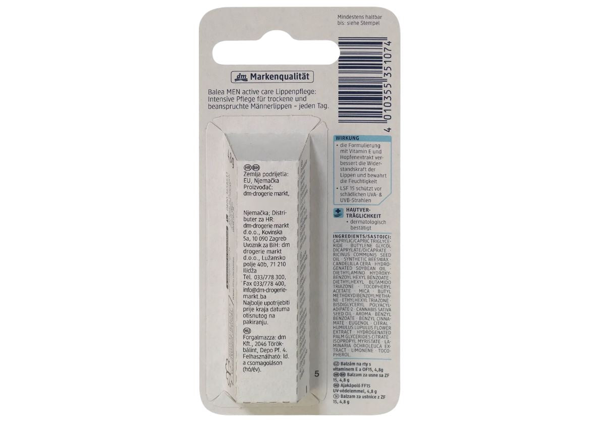 Le baume à lèvres Balea MEN Active Care est spécialement conçu pour les hommes. Il hydrate et protège efficacement les lèvres contre le dessèchement, le vent et le froid, tout en laissant une sensation naturelle sans brillance.